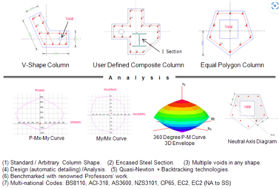 BS8110, ACI-318, AS3600,NZS3101, CP65, EC2, EC (NA to SS) code of practice design.