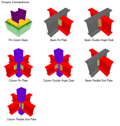 Simple Connections: Pin Column Base, Beam Fin Plate, Beam Double Angle Cleat, Column Fin Plate, Column Double Angle Cleat, Beam Flexible End Plate, Column Flexible End Plate